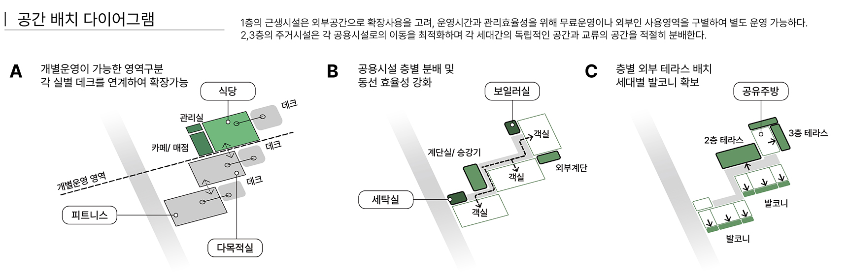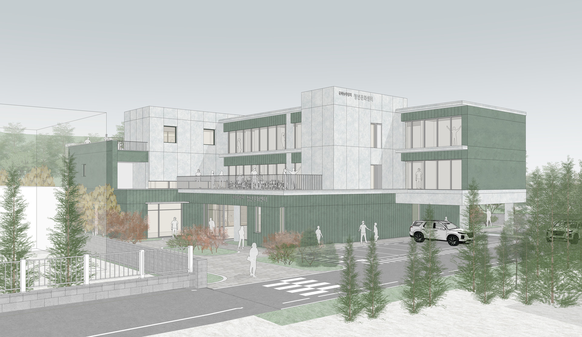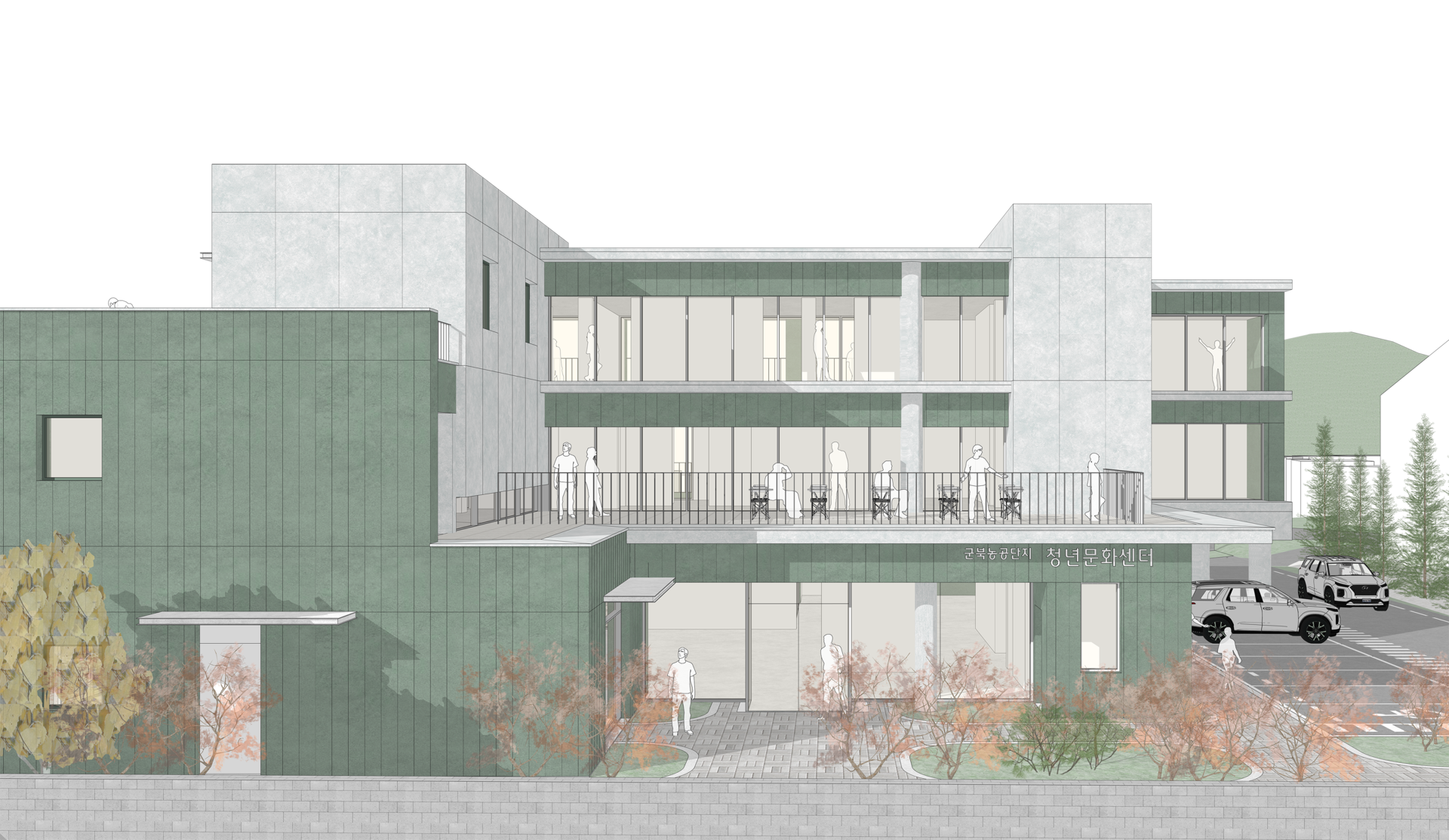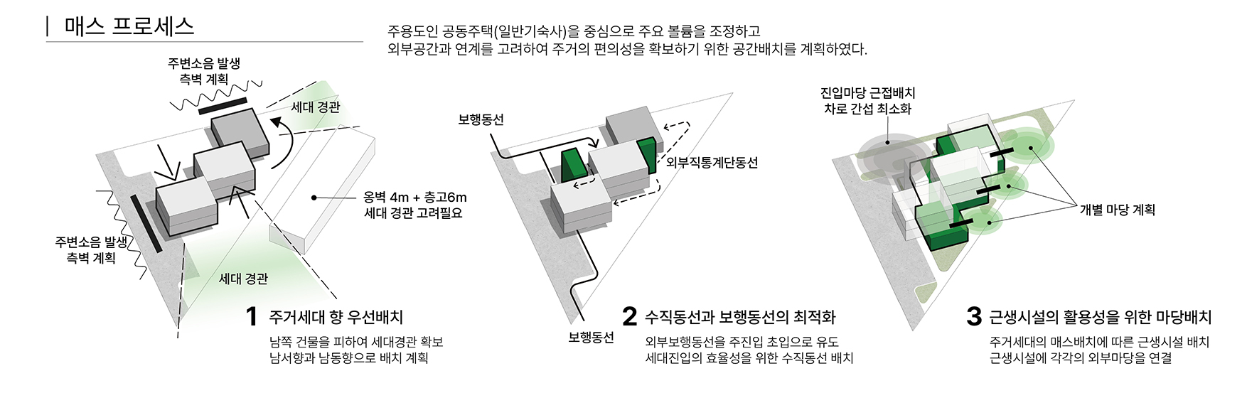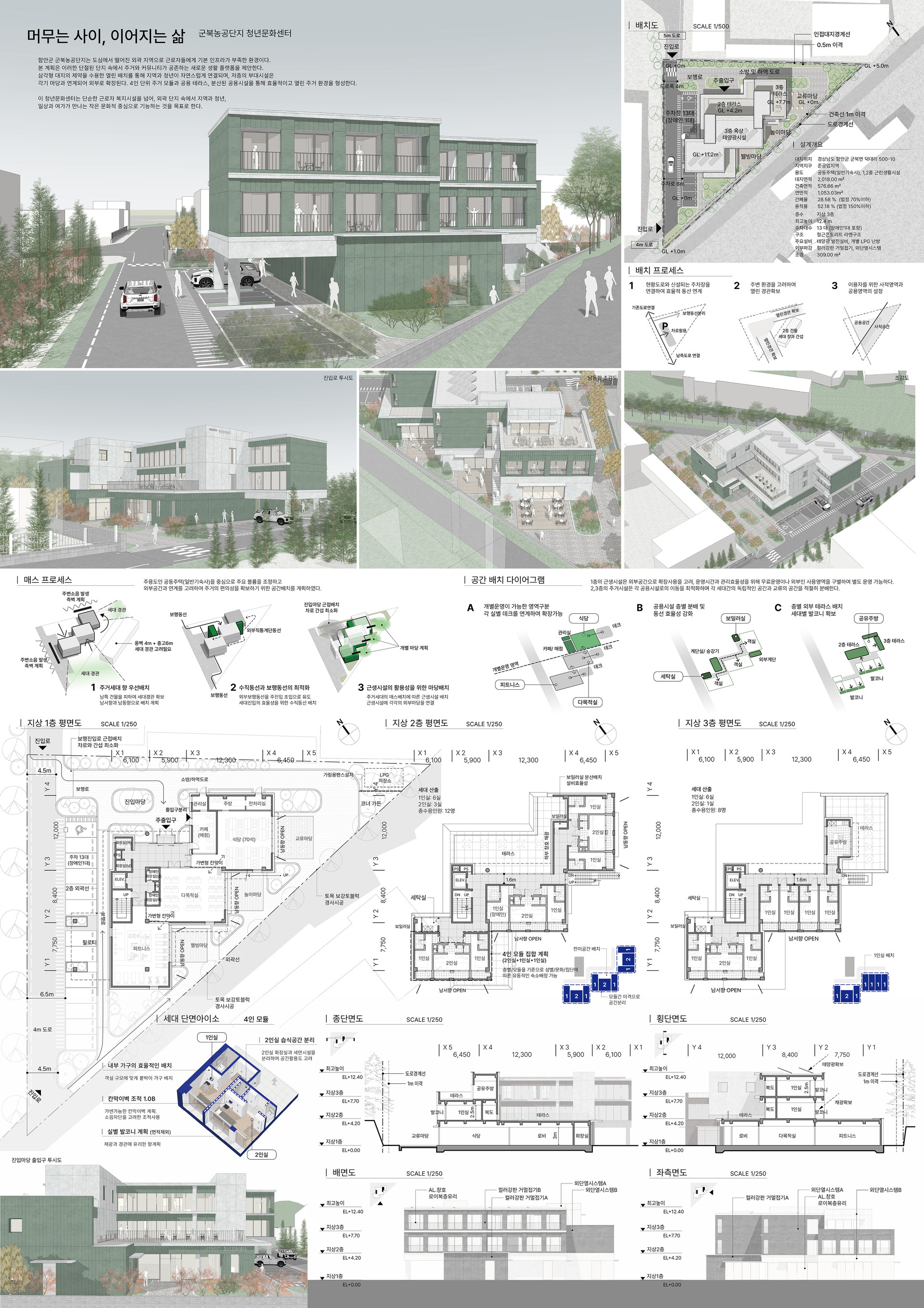 함안군 군북농공단지는 도심에서 떨어진 외곽 지역으로 근로자들에게 기본 인프라가 부족한 환경이다. 본 계획은 이러한 단절된 단지 속에서 주거와 커뮤니티가 공존하는 새로운 생활 플랫폼을 제안하다. 삼각형 대지의 제약을 수용한 열린 배치를 통해 지역과 청년이 자연스럽게 연결되며, 저층의 부대시설은 각기 마당과 연계되어 외부로 확장된다. 4인 단위 주거 모듈과 공용 테라스, 분산된 공용시설을 통해 효율적이고 열린 주거 환경을 형성한다.