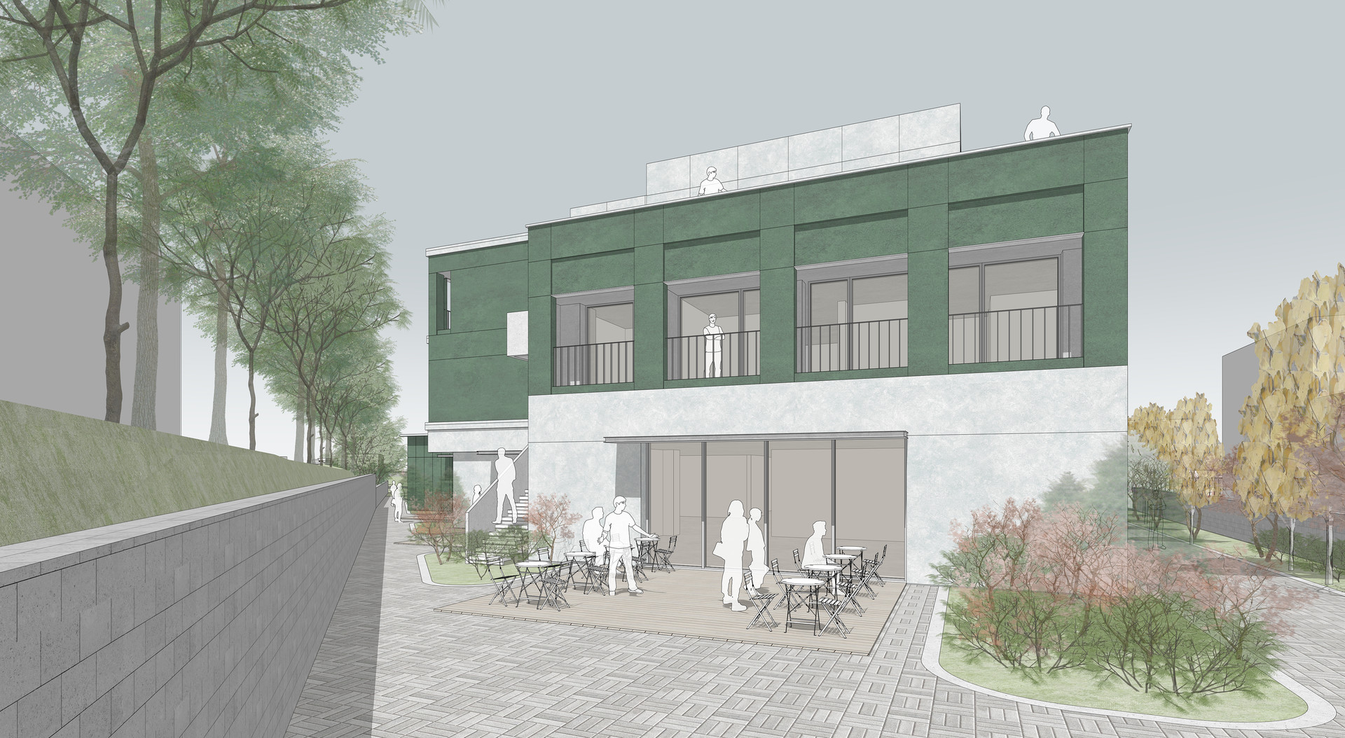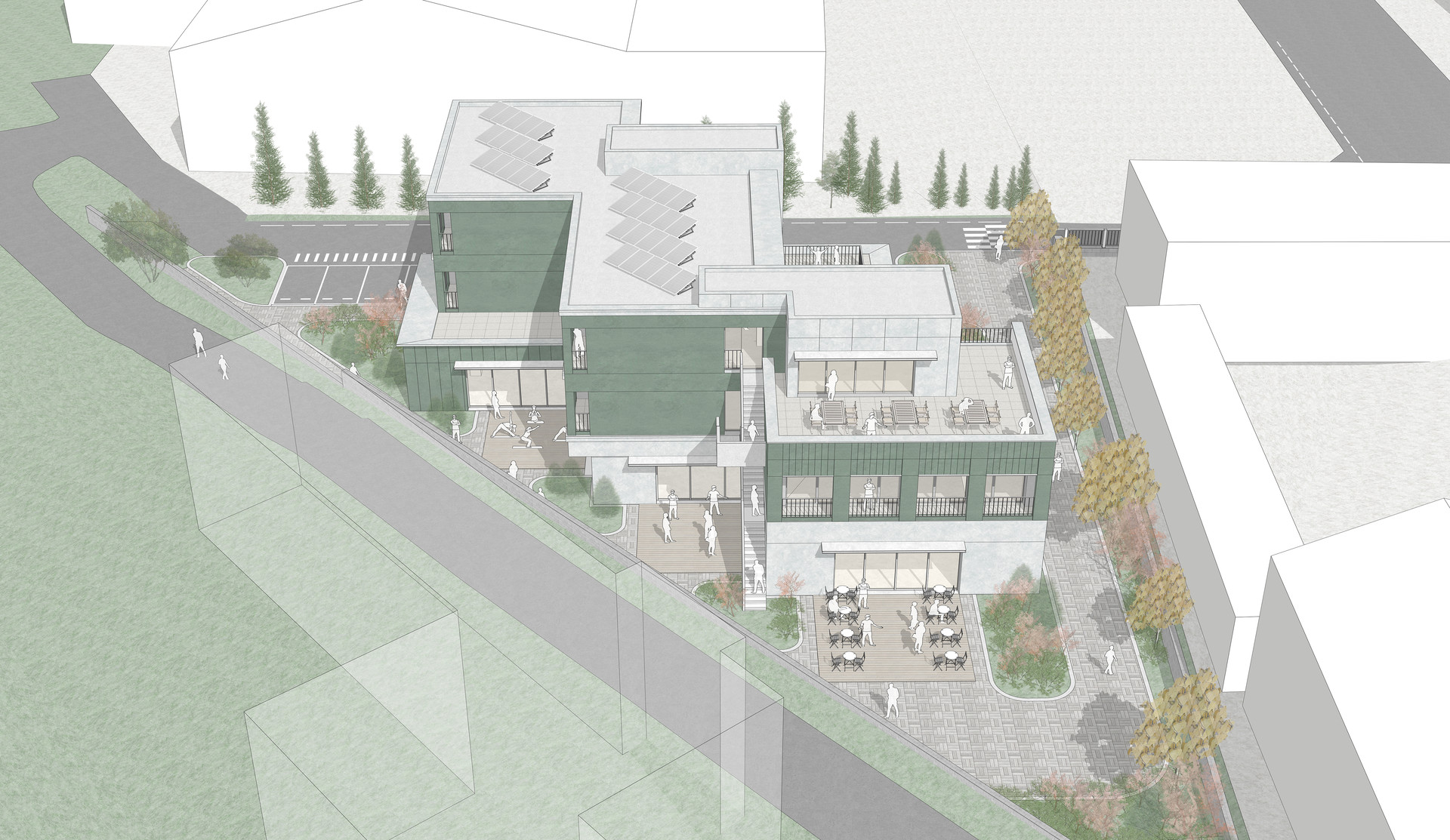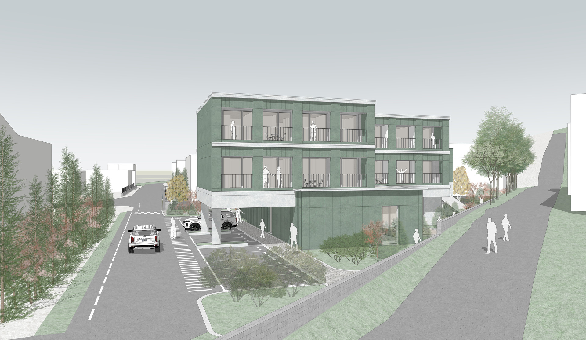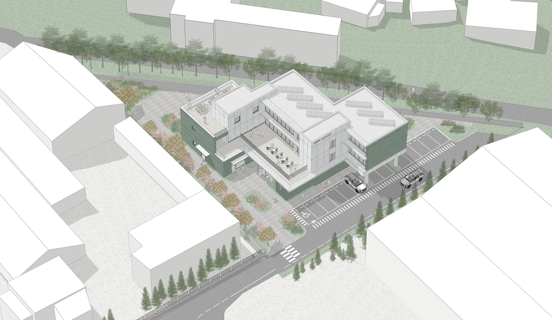 함안군 군북농공단지는 도심에서 떨어진 외곽 지역으로 근로자들에게 기본 인프라가 부족한 환경이다. 본 계획은 이러한 단절된 단지 속에서 주거와 커뮤니티가 공존하는 새로운 생활 플랫폼을 제안하다. 삼각형 대지의 제약을 수용한 열린 배치를 통해 지역과 청년이 자연스럽게 연결되며, 저층의 부대시설은 각기 마당과 연계되어 외부로 확장된다. 4인 단위 주거 모듈과 공용 테라스, 분산된 공용시설을 통해 효율적이고 열린 주거 환경을 형성한다.