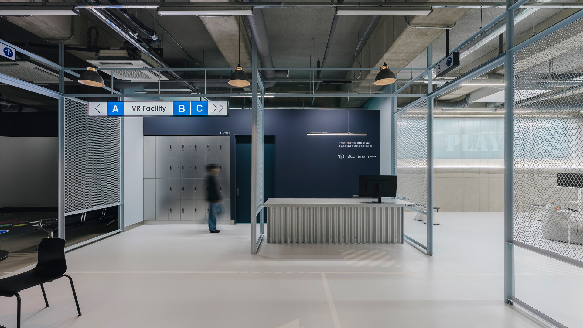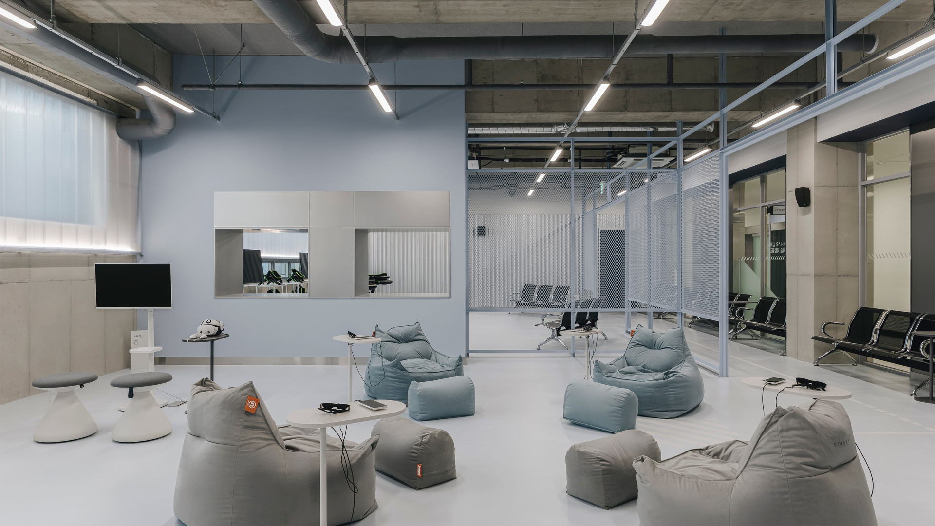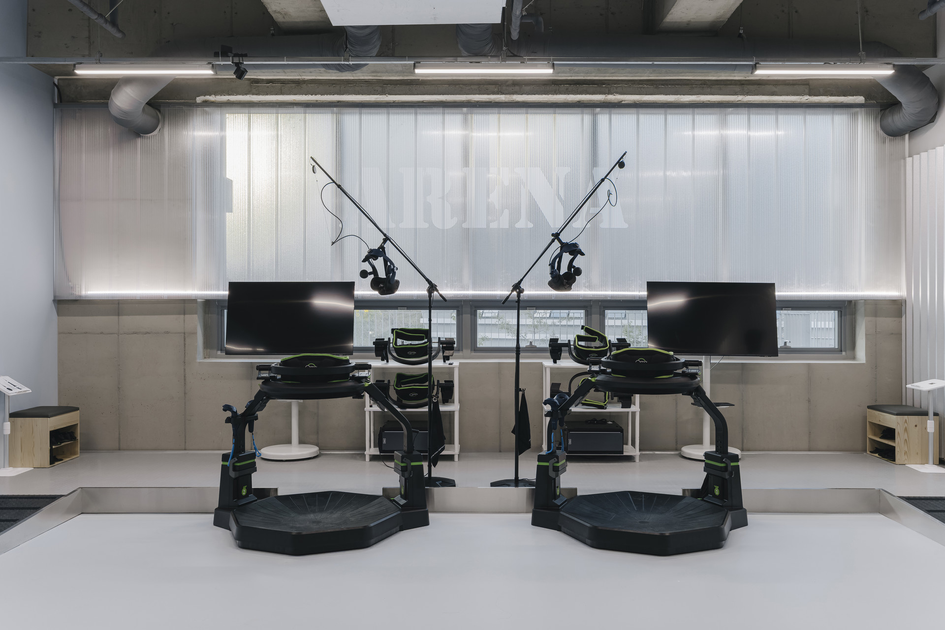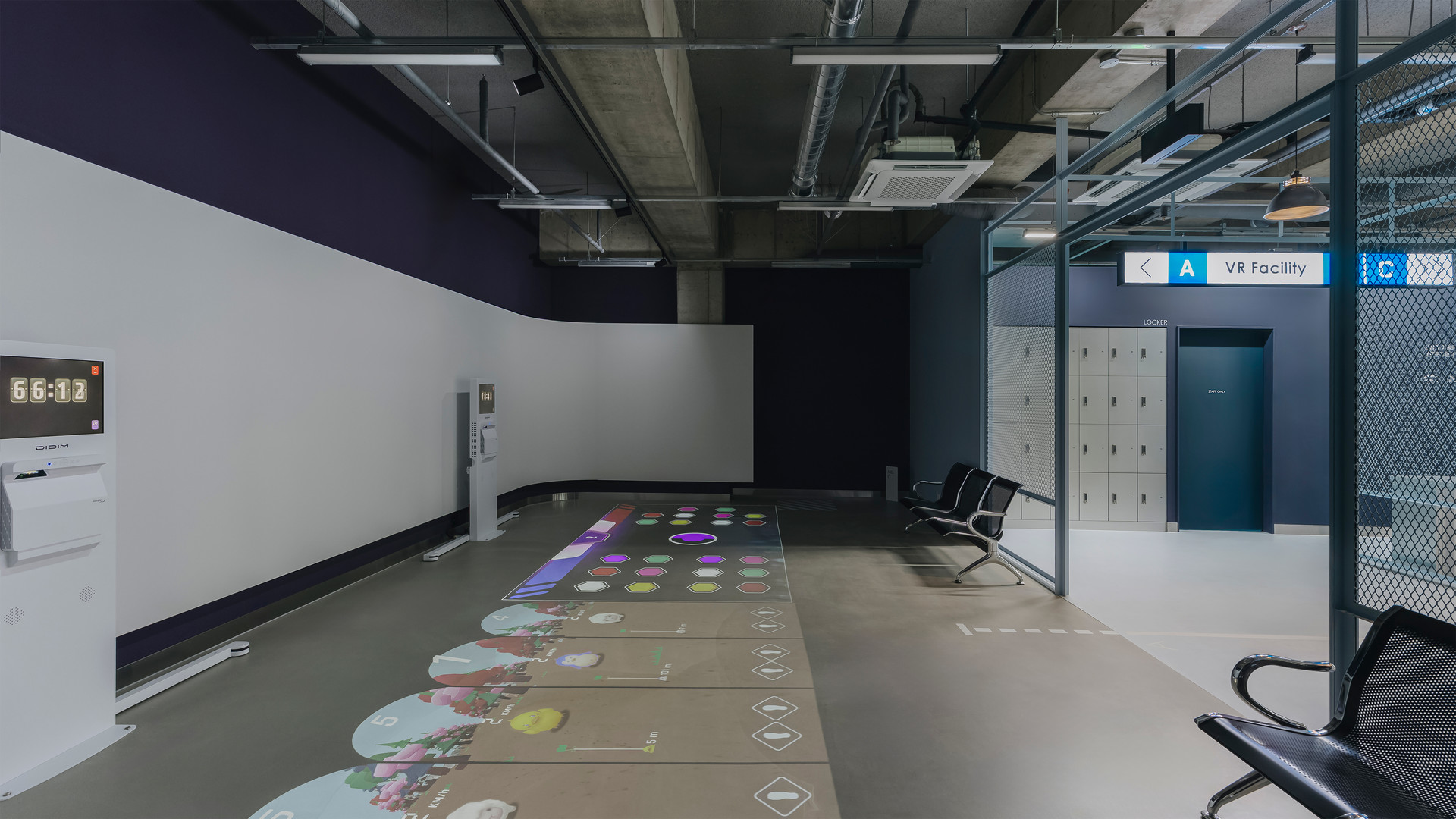 VR 트레드밀 존: 여럿이 함께 호흡을 맞추며 플레이할 수 있는 그룹형 공간으로 구성.