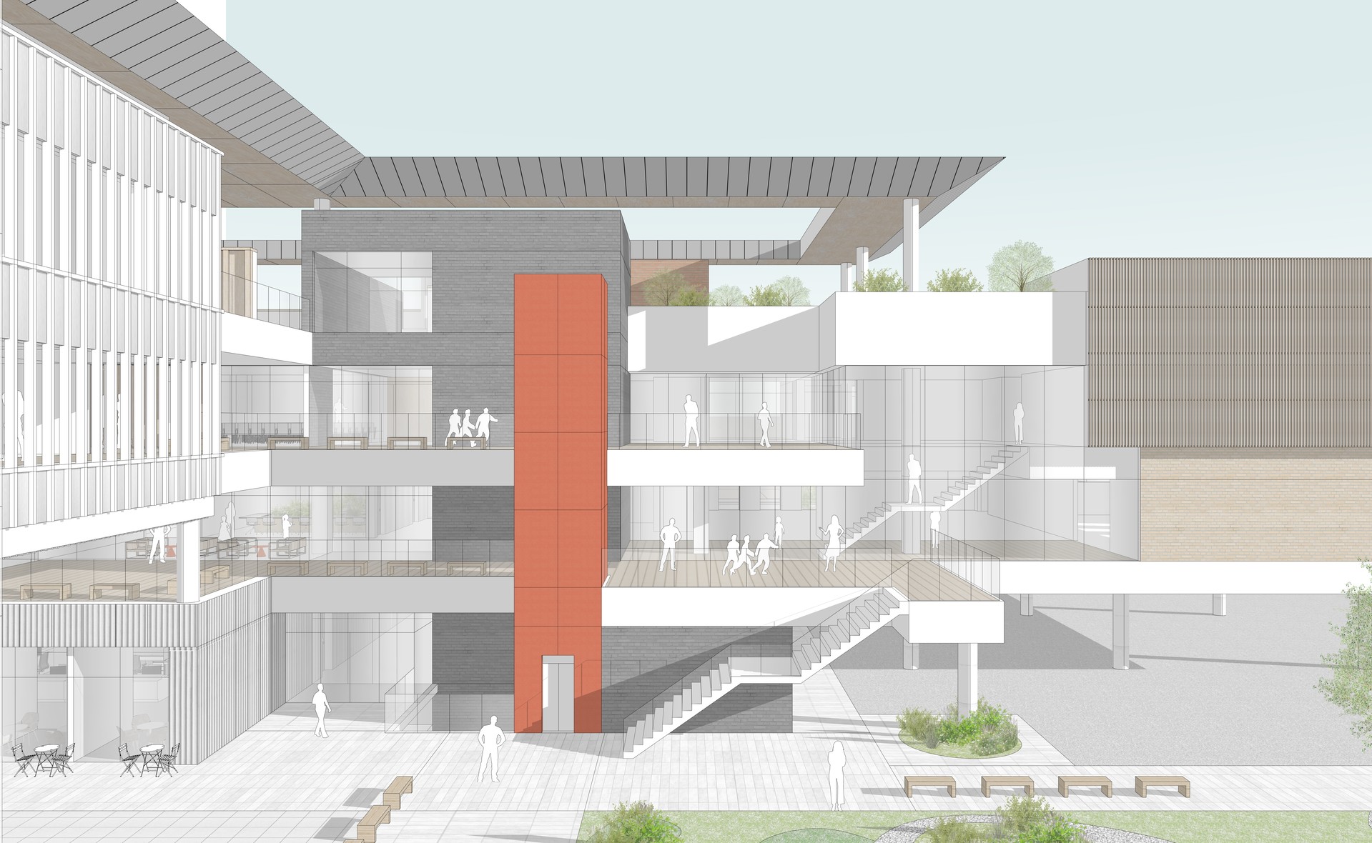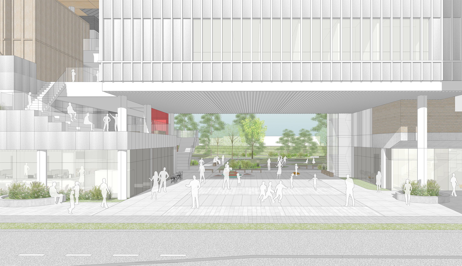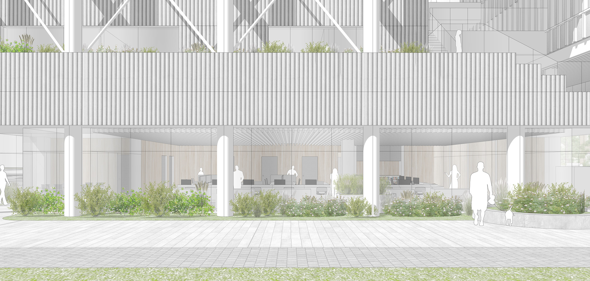 반면에 경기복지재단은 일반 민원인보다는 복지 관련 직군의 특정 관계자들이 방문하고 업무를 보는 곳입니다. 따라서 분명한 목적 동선과 복지재단 내 부서들 간의 소통 및 협력이 중요한 업무 공간입니다. 이렇듯 성격이 다른 두 가지 기능을 효율적으로 분리하는 동시에, 도시와 자연으로 열린 오픈 스페이스를 통해 모든 사용자들이 자연스럽게 모이고 흩어지며 교류할 수 있는 장소를 제안합니다.