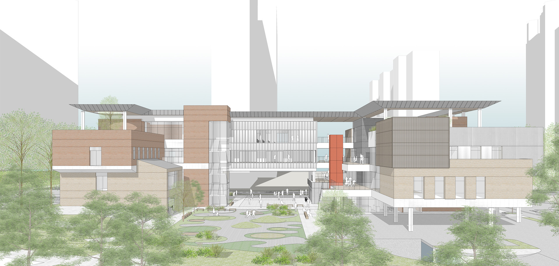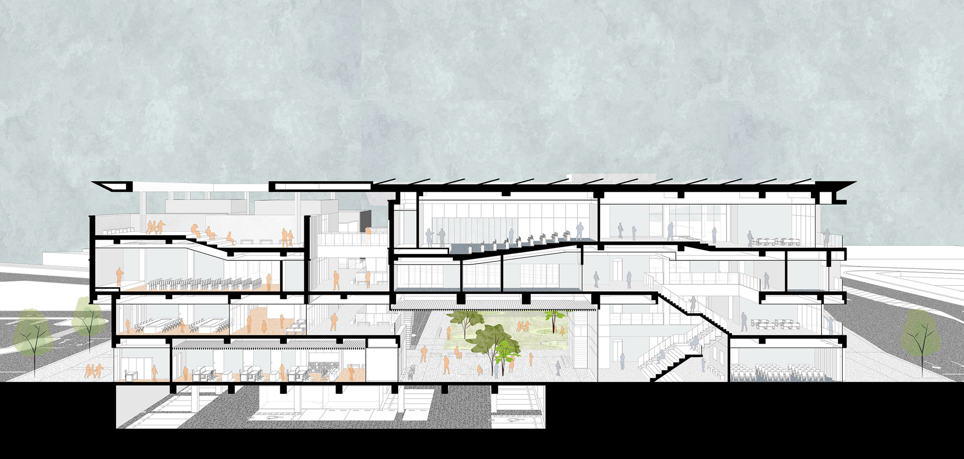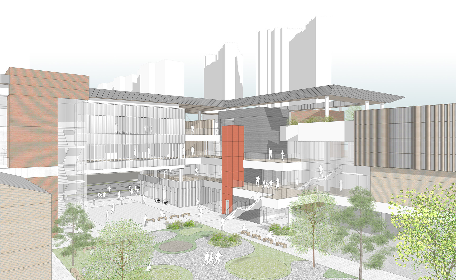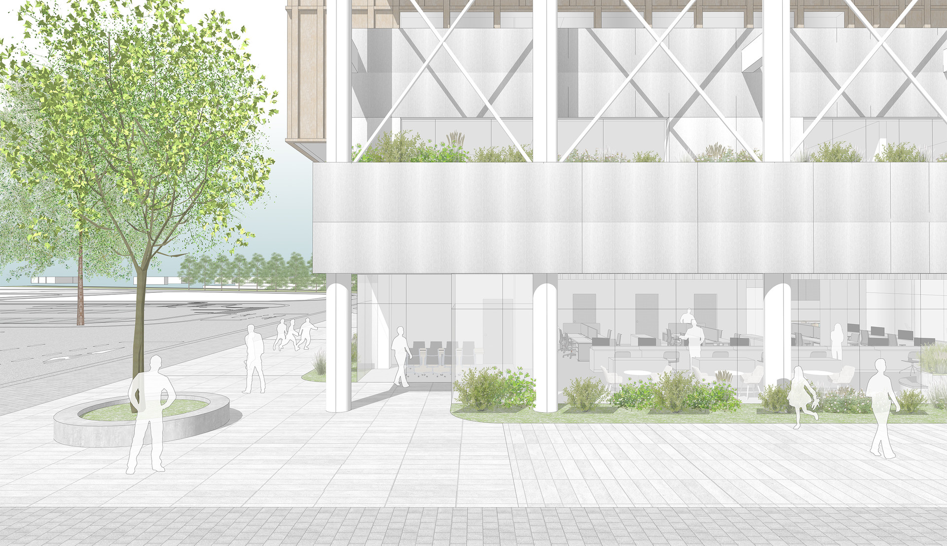 반면에 경기복지재단은 일반 민원인보다는 복지 관련 직군의 특정 관계자들이 방문하고 업무를 보는 곳입니다. 따라서 분명한 목적 동선과 복지재단 내 부서들 간의 소통 및 협력이 중요한 업무 공간입니다. 이렇듯 성격이 다른 두 가지 기능을 효율적으로 분리하는 동시에, 도시와 자연으로 열린 오픈 스페이스를 통해 모든 사용자들이 자연스럽게 모이고 흩어지며 교류할 수 있는 장소를 제안합니다.