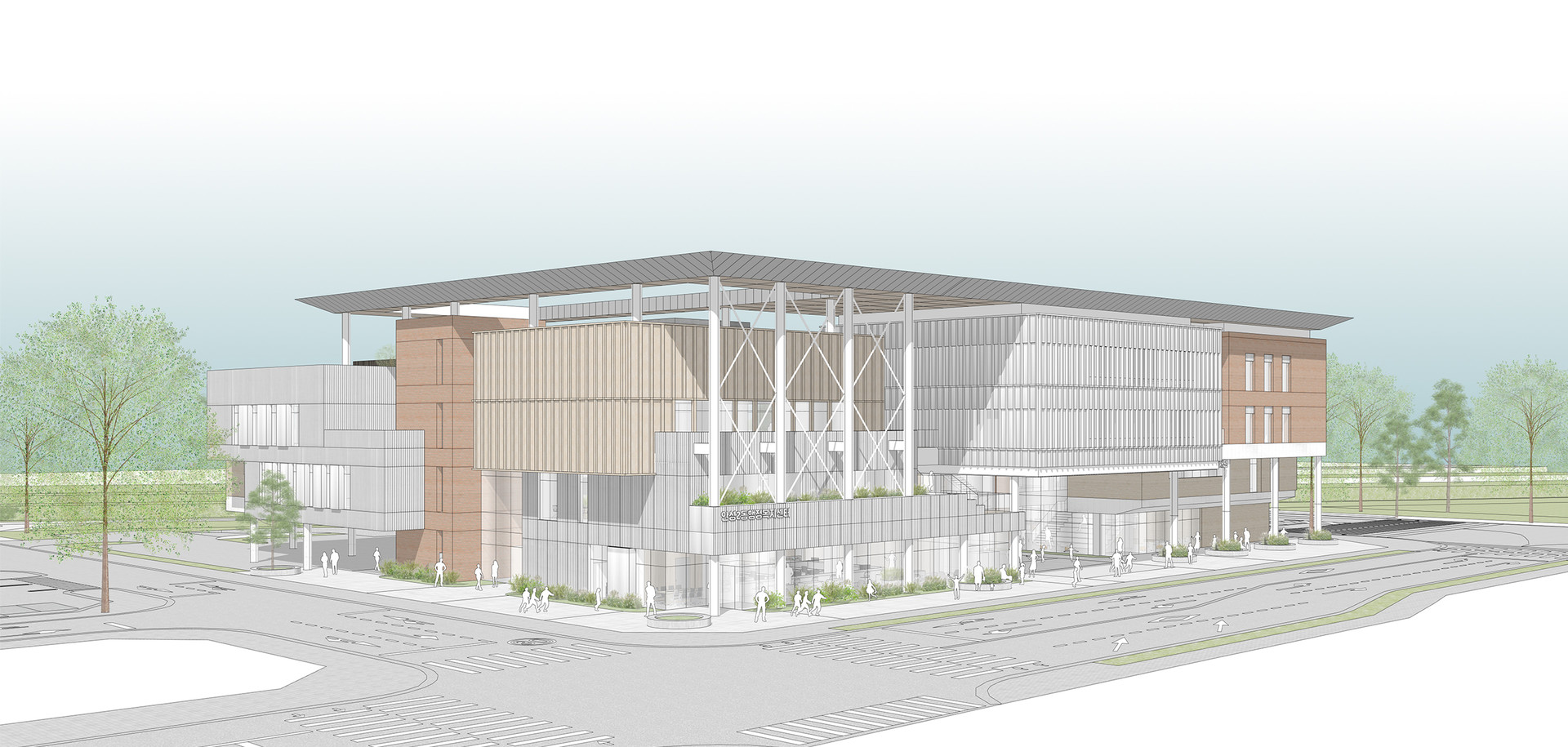 아양 택지개발지구의 새로운 행정복지센터는 경기복지재단과의 복합 건립을 통해 새로운 행정·복지 사업 모델을 제시합니다. 대규모 주거단지와 자연이 만나는 도시 경계부에 위치한 "게이트"는 도시와 자연을 연결하고 시민들을 끌어들이는 상징성을 갖습니다. 대지를 둘러싸고 부유하는 듯한 "지붕"은 한 지붕 아래 모여 사는 지역 사회의 공동체적 가치를 상징합니다. 또한, 금석천과 맞닿아 조성된 "자연정원"은 안성 도시계획의 미래 비전인 친환경 생태도시를 상징적으로 구현합니다.
