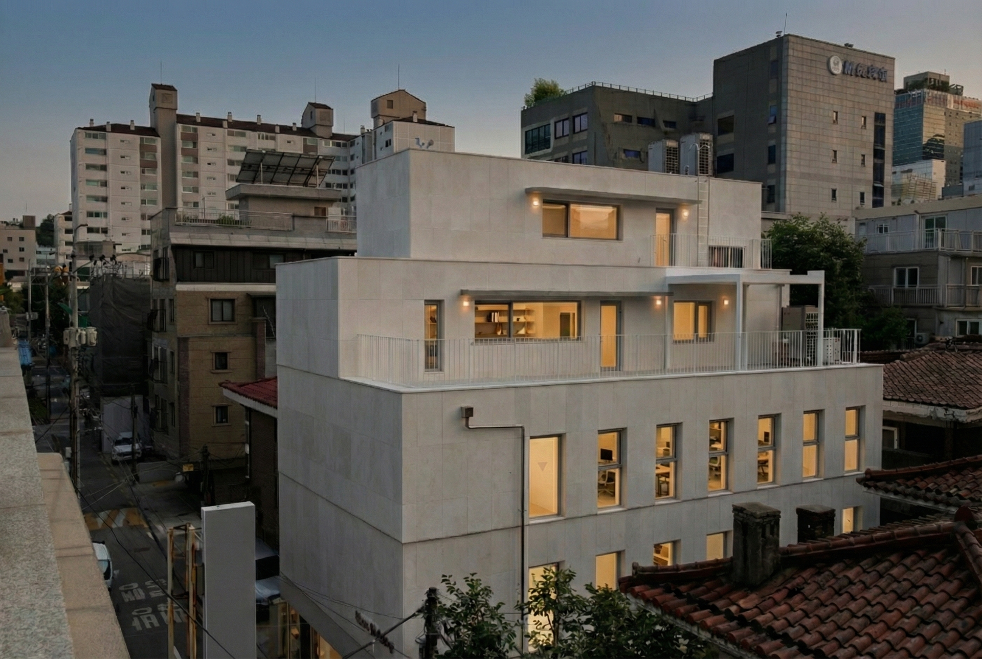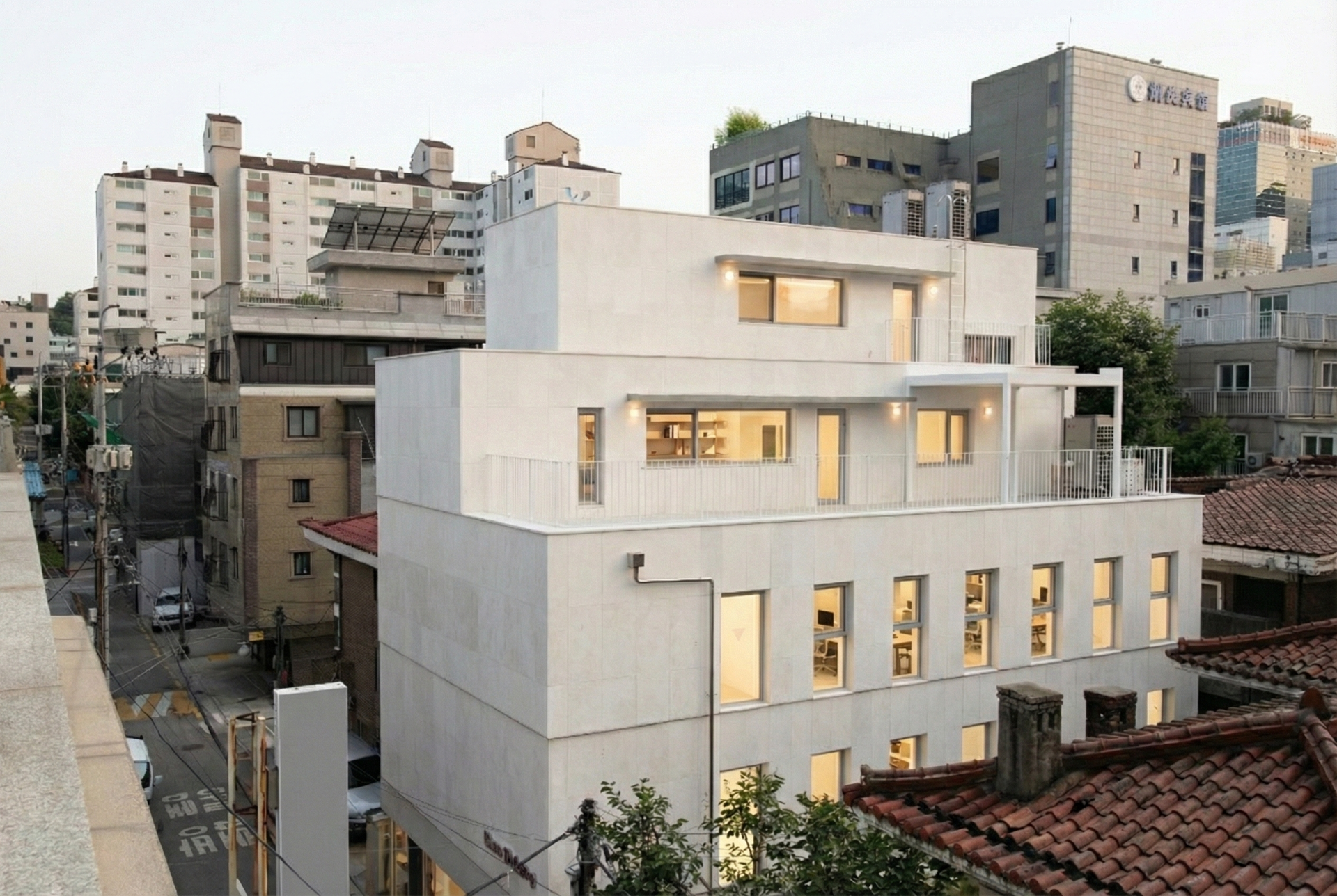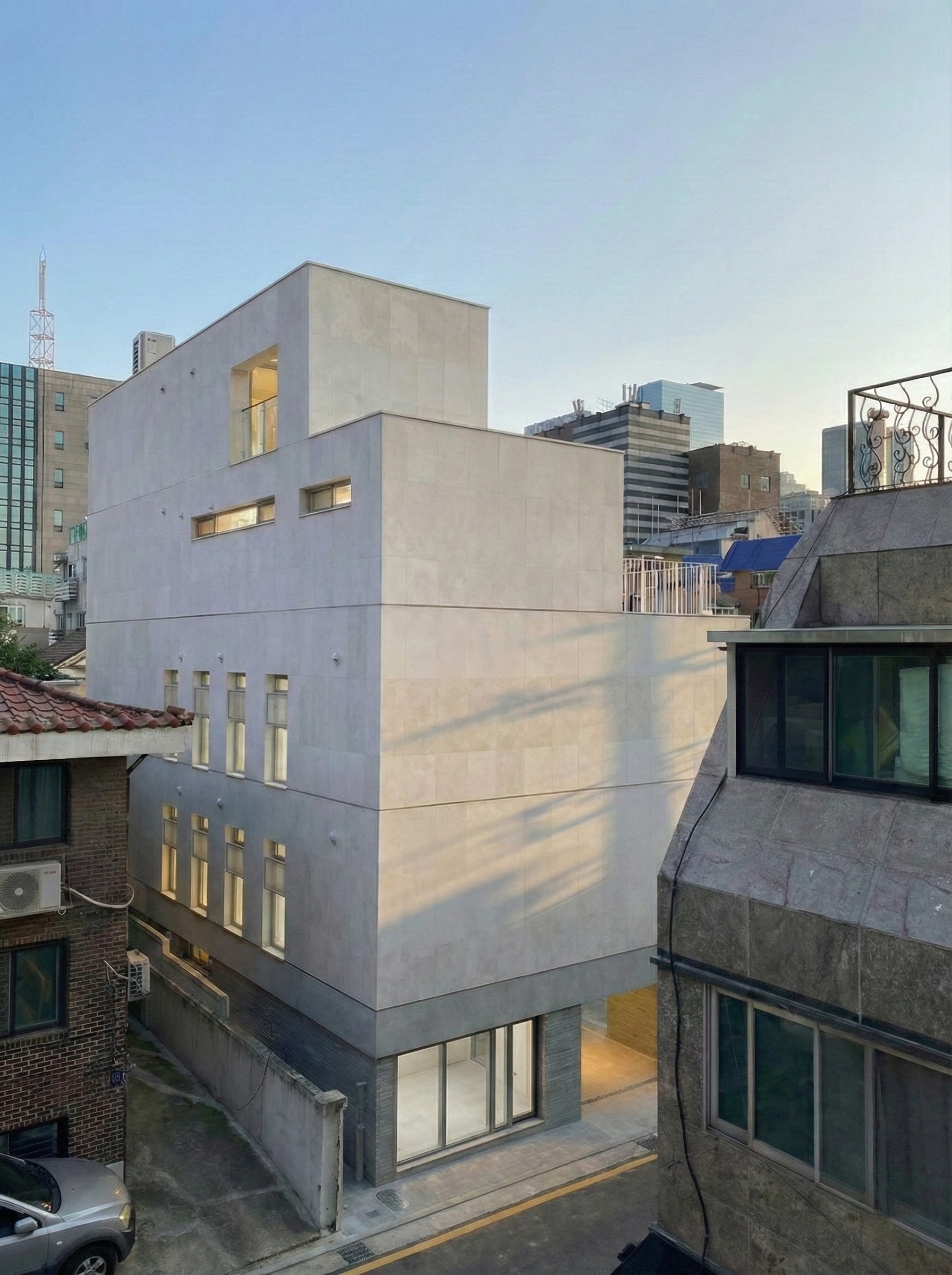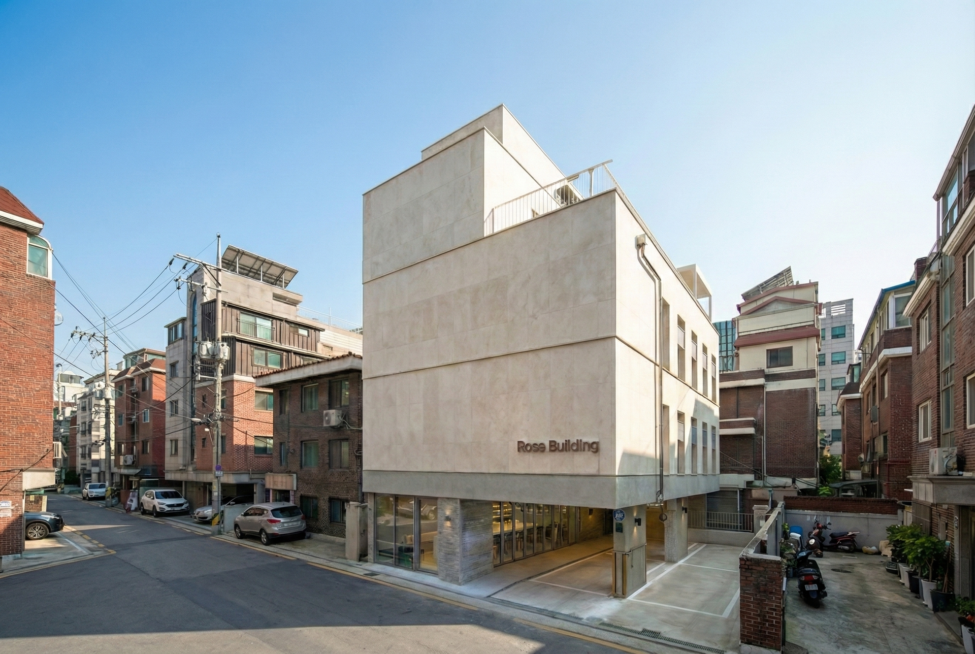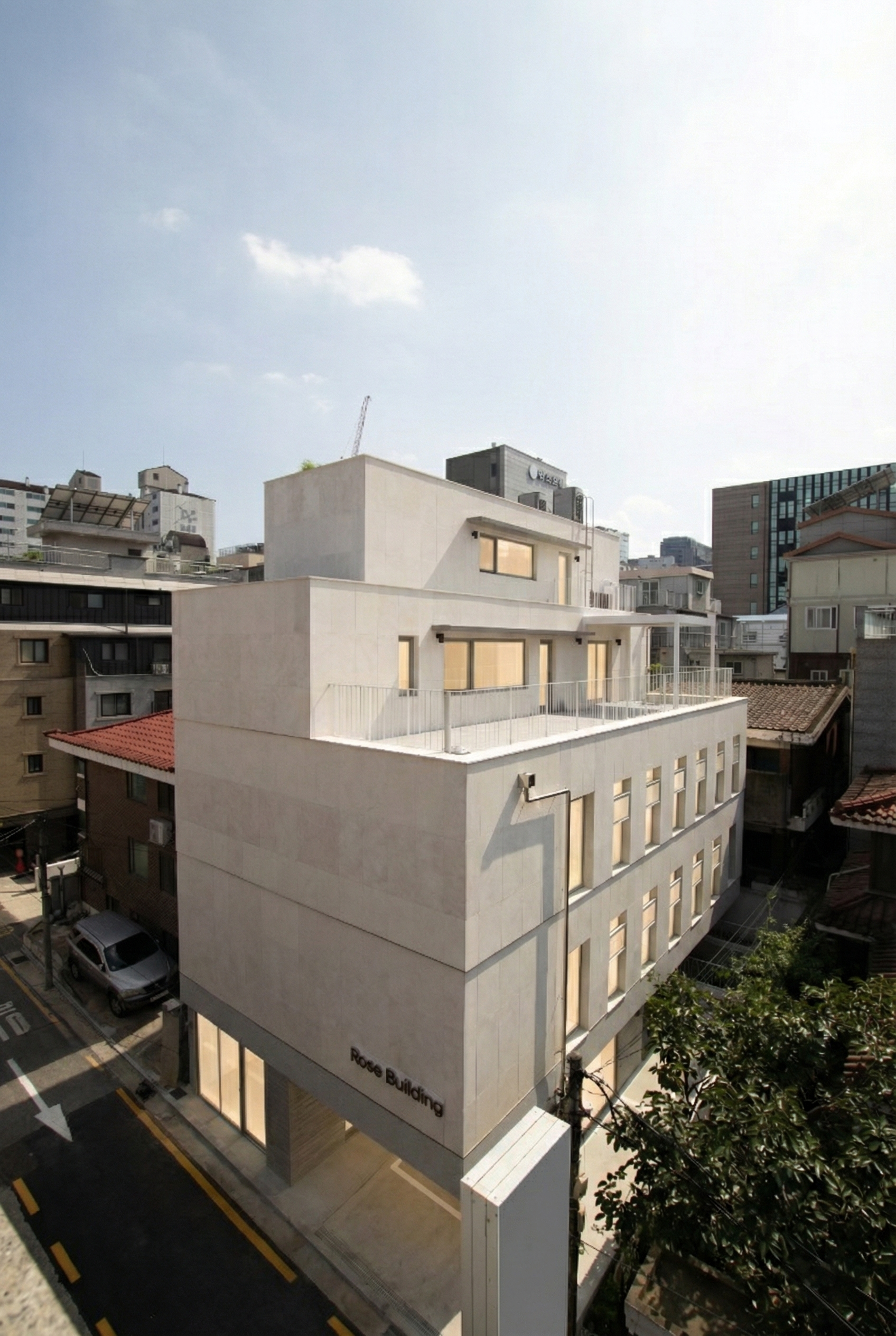 로즈그룹이 제시하는 미래에 대한 희망과 공간의 가치를 담아 내기위한 설계를 진행 했습니다. 천창을 통한 빛의 유입과 하늘로 열린 옥상정원은 내부공간을 확장하고 빛을 담는 우물 역할을 합니다. 지하의 선큰정원은 지하 사무실공간에 은은한 빛을 들이고 환기를 시키는 작지만 중요한 보이드 공간입니다. 좁은도로를 사이에 두고 즐비하게 서있는 원룸 건물들 사이로 하얗고 단단한 덩어리가 차곡차곡 쌓여있는 듯한 입면은 공간의 볼륨이 커보이게 하며 단단한 이미지를 줍니다. 밝은색 마감재는 골목에 빛을 들이고 골목이 조금 더 밝아지게 합니다. 이곳을 찾는 사람들에게 다양한 빛을 담은 건물로 인식되길 바랍니다.